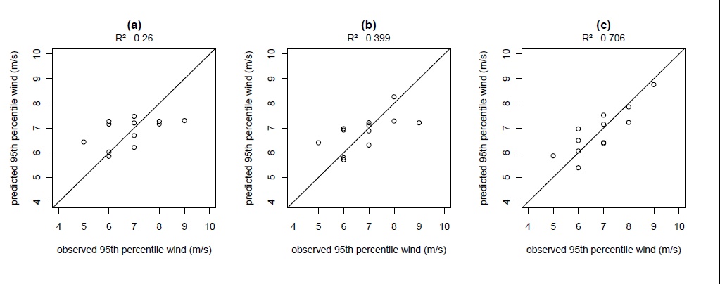 Figure 1: Relationship of observed wind speed to predicted wind speed using (a) topex-to-distance 2km, (b) topex-to-distance 2km and elevation, and (c) topex-to-distance 0.5 km, 1 km, 2km, 3km and elevation as explanatory variables. Models (a) and (b) are simple linear regressions. Model (c) is a principal component regression.